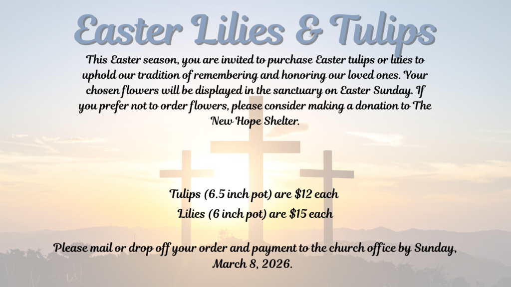 If you are unable to join in person, please join us virtually on YouTube, Sunday mornings at 9:30 AM during the summer and Christmas, and at 10:45 AM the rest of the year. You can find a copy of our February 22nd bulletin here.