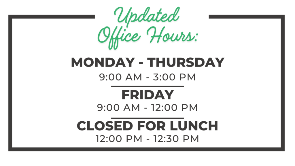 Friday: 9:00AM – 12:00 PM Closed for lunch 1200 PM – 12:30 PM